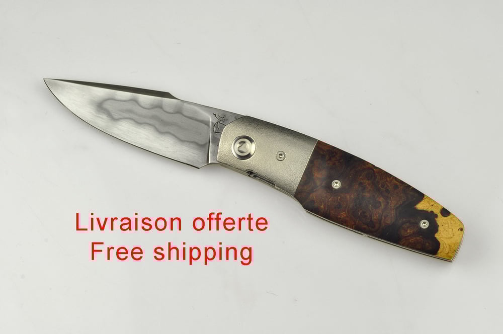 Linerlock Kaïlash, lame en 26c3 et manche en titane et loupe de bois de fer d'Arizona stabilisée monté sur roulements céramiques